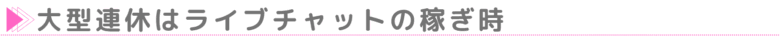『お財布の紐が緩くなる+男性会員さんのログイン数がいつもより高い』という二つの要素も相まって、いつもよりも稼ぐチャンスが巡ってくる時期が大型連休です。